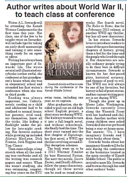 I’ll be teaching a class at the Kanab Writers Conference on October 25. The local newspaper, the Southern Utah News, posted an article about my writing as part of their lead-up to the event. (Click on the image for a larger view.)